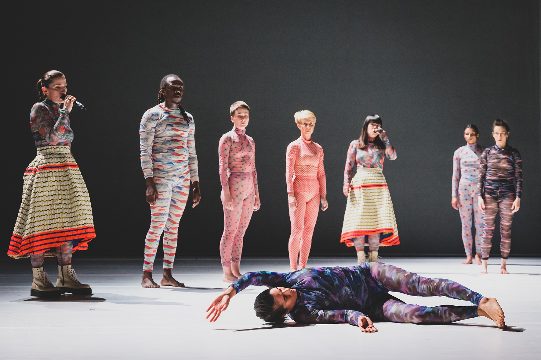 Dans cette mise en orbite, danse et chant sont en étroite corrélation. Les voix de Joséphine Philip et Hannah Schneider, compositrices et chanteuses danoises, font partie intégrante de la création. En direct sur scène, leur chant habite la danse et traverse les corps.